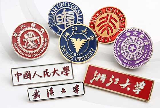 一金屬,合樂禮品打造的學(xué)?;照?,采用鋅合金材質(zhì),經(jīng)過壓切,咬版,拋光,上色,利用金屬的光澤將學(xué)校logo和圖案很好的展示出來,常用仿琺瑯工藝或者烤漆工藝。